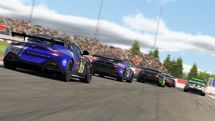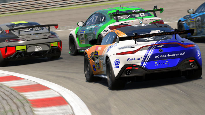 Um 13 Uhr war es dann so weit. Die SP9 (GT3) startete in die Formationsrunde und eröffneten den ersten Saisonlauf. Unsere Klasse der SP10 startete 3 Minuten versetzt ins Rennen. Alexander übernahm den Start im Orange-Weißen Aston Martin und das Ziel war klar: Keine Fehler machen und in keine Unfälle verwickelt werden. Daher ging Alexander die erste Runde mit einem guten Maß Vorsicht an. Bereits im Bereich Quiddelbacher Höhe stand bereits der erste Kontrahent quer auf der Fahrbahn was erneut bewies, Vorsicht zahlt sich manchmal aus. Nachdem Alexander dann 2 Runden einen anderen Aston Martin verfolgte und die anderen SP10 Fahrzeuge langsam davonzogen, bog der besagt Aston Martin in die Box ab, um eine Durchfahrtsstrafe aus dem Qualifying zu absolvieren. Alexander war ab diesem Zeitpunkt damit beschäftigt den Abstand nach vorne nicht zu groß werden zu lassen und die ersten Überrundungen sicher zu Managen. Der Rest des Doppelstintes (Aufgrund begrenztem Tankinhalt war ein Stint nur 4 Runden lang) verlief reibungslos. Die Rundenzeiten waren solide und die Überrundungen waren sauber. Dann übergab Alexander an Maximilian, welcher für ebenfalls 2 Stints ins Auto ging. Das erste Mal rausfahren mit kalten Reifen bildet immer eine Gefahr, aber Maximilian absolvierte die erste Runde seines Stints meisterhaft und spulte danach Runde für Runde ab während immer ein Auge auf das Livetiming wandert, um zu sehen, was die Konkurrenz macht. Nachdem die SP9-Armader so weit vorbei war, musste Maximilian weiterhin in den Rückspiegel schauen, denn die Porsche Cup holten ebenso zur Überrundung auf. Mit eben so einem Cup Porsche gab es dann einen kleinen Zwischenfall als dieser den Scheitelpunkt in der Klostertal-Kurve verpasste und Maximilian einen kleinen Treffer auf die Front gab. Nach einem kurzen Schreckmoment war jedoch klar, kein Schaden. Also weiter. Weiterhin ein Auge auf die Strategie, denn diese sollte noch Spannung versprechen. Nach zwei mehr als Soliden Stints von Maximilian, übergab dieser dann wieder an Alexander für den letzten Stint. Das Team hatte nun eine große Lücke auf der Strecke abgepasst, was Alexander ermöglichte, ohne Überrundungsverkehr, den Aston Martin bis ans Limit zu pushen. Kurz vor Rennende stand dann fest, ein kurzer Tankstopp wird nötig sein, um die letzte Runde zu schaffen. Also auf Platz 8 liegend, zu beginn der letzten Runde, zum Nachtanken an die Box, ein paar Liter reinlaufen lassen und wieder auf die Strecke für den Endspurt über 24,358 Kilometer. Beim Anbremsen zur ersten Kurve tauchte dann Platz 9 im Rückspiegel auf und rückte an die Stoßstange des Aston Martin. Die letzte Runde also immer mit einem Auge im Rückspiegel, steuerte Alexander das Auto durch die Grüne Hölle, immer mit dem Versuch die Lücke zum BMW GT4 hinter ihm zu vergrößern, aber dieser ließ nicht abreißen. Daher ging es zum Sprint hintereinander auf die Döttinger Höhe. Ein Sprintduell bei ~260 km/h. Kurz vor Ende der geraden war der BMW dann dran, und trotz der inneren Linie, reichte der Überschuss des BMW um runter zur Tiergarten-Senke vorbeizuziehen. In der Anbremszone war das Team dann machtlos und so beendeten Alexander und Maximilian das Rennen auf Platz 9 in der SP10 und damit als bester Aston Martin. Die beiden sind mehr als zufrieden mit dem Ergebnis welches Zeigt: Es reicht bisher nicht für ganz vorne, aber Sie sind dran am Feld.